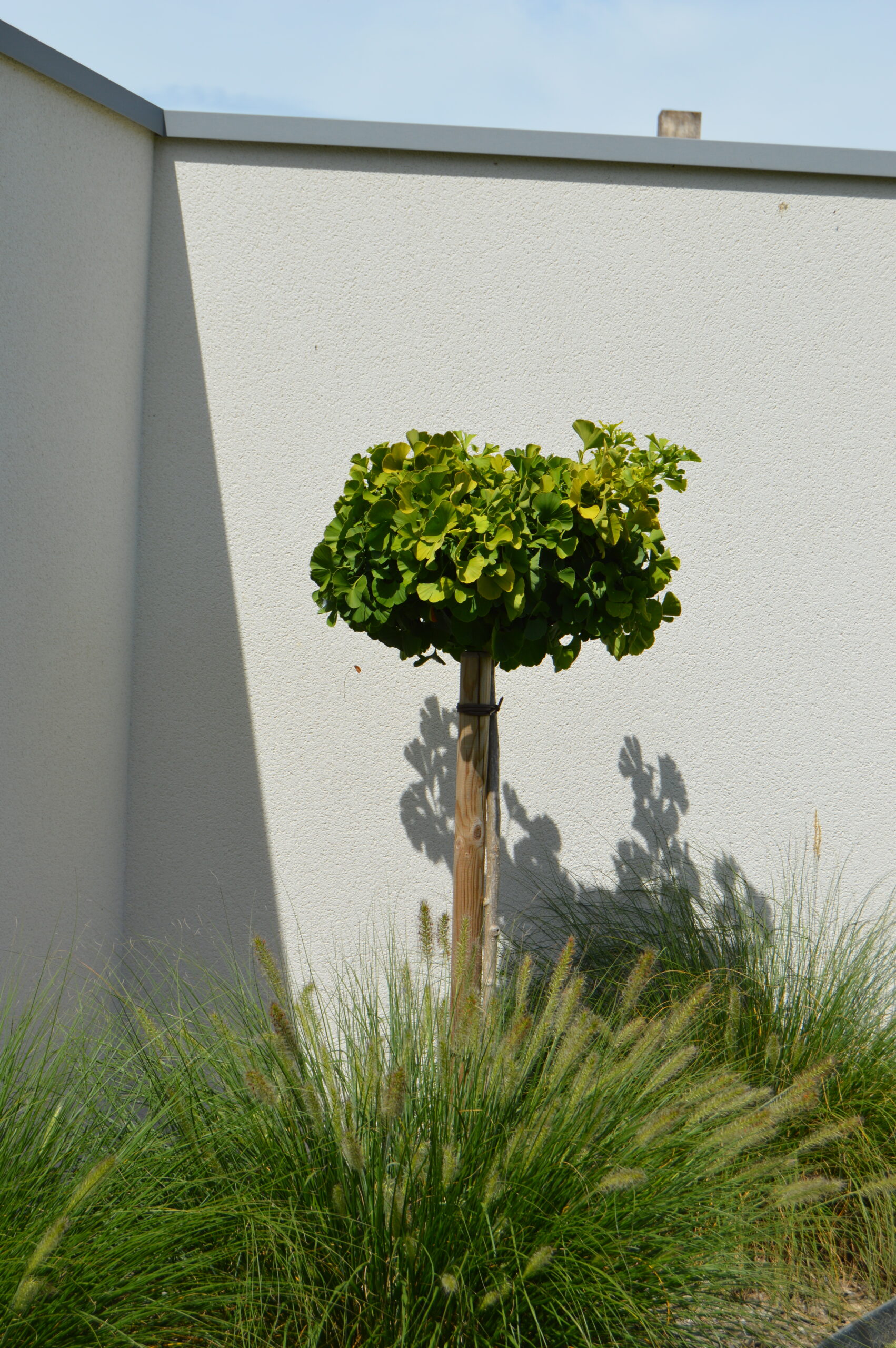 Clôture composite et murs maçonnés pour fermer cette propriété. Coin détente en fond de jardin en pavés.