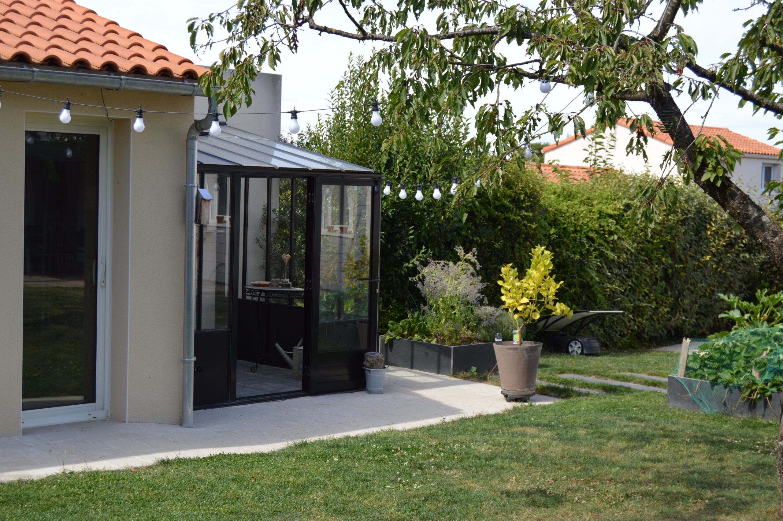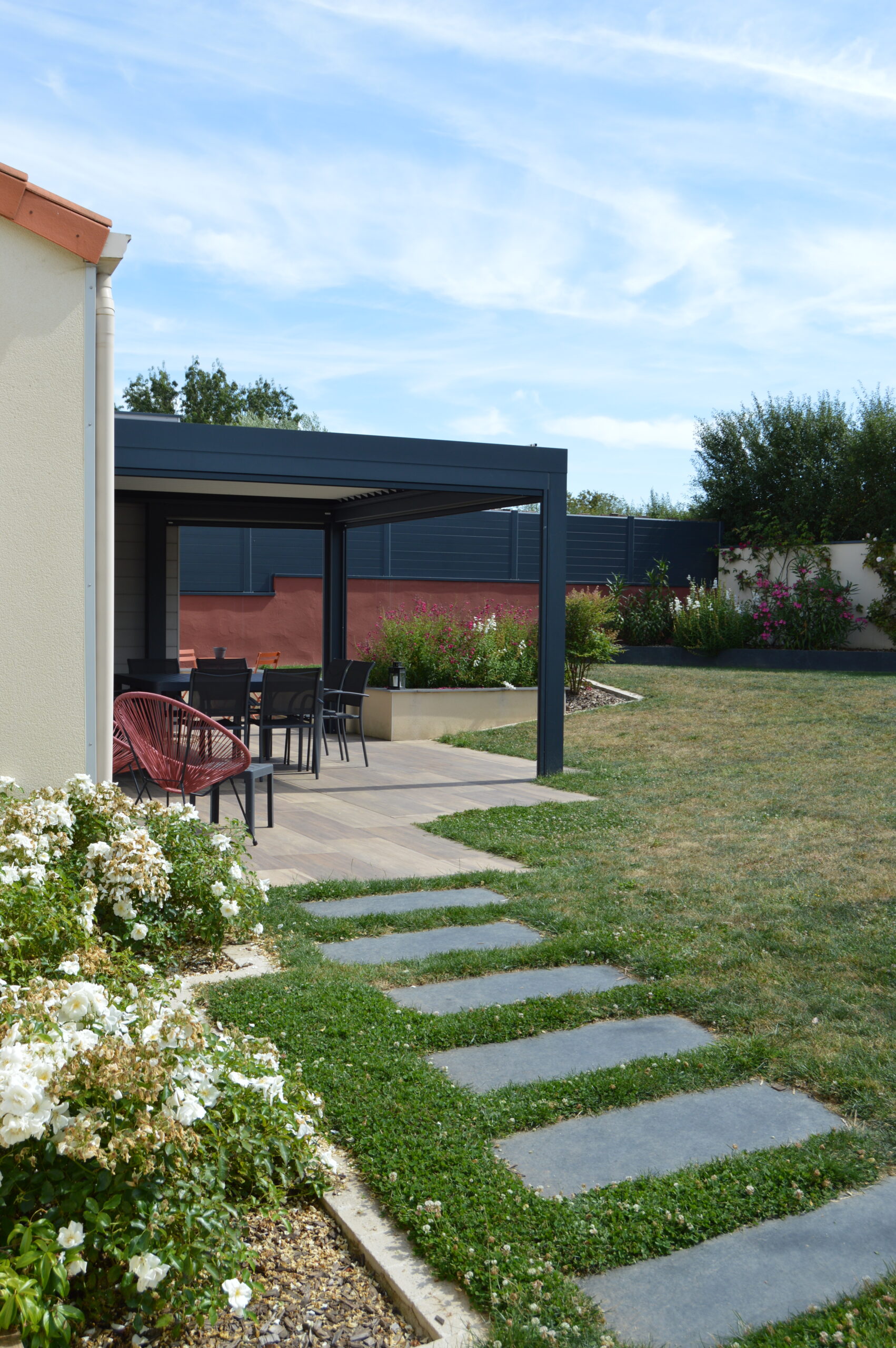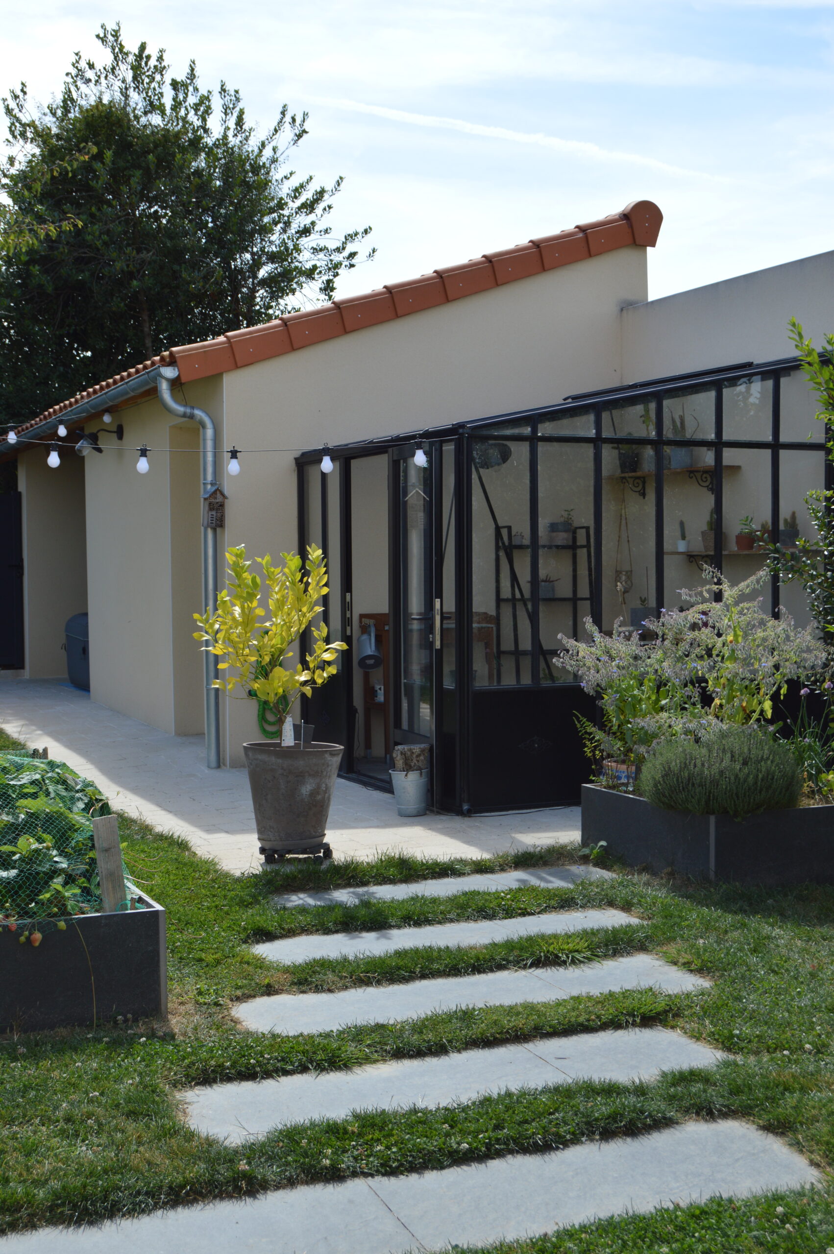 Ce jardin s’articule autour d’une terrasse en grès cérame et d’un coin potager. Les deux espaces sont reliés par un éclaté de pas japonais en ardoise.