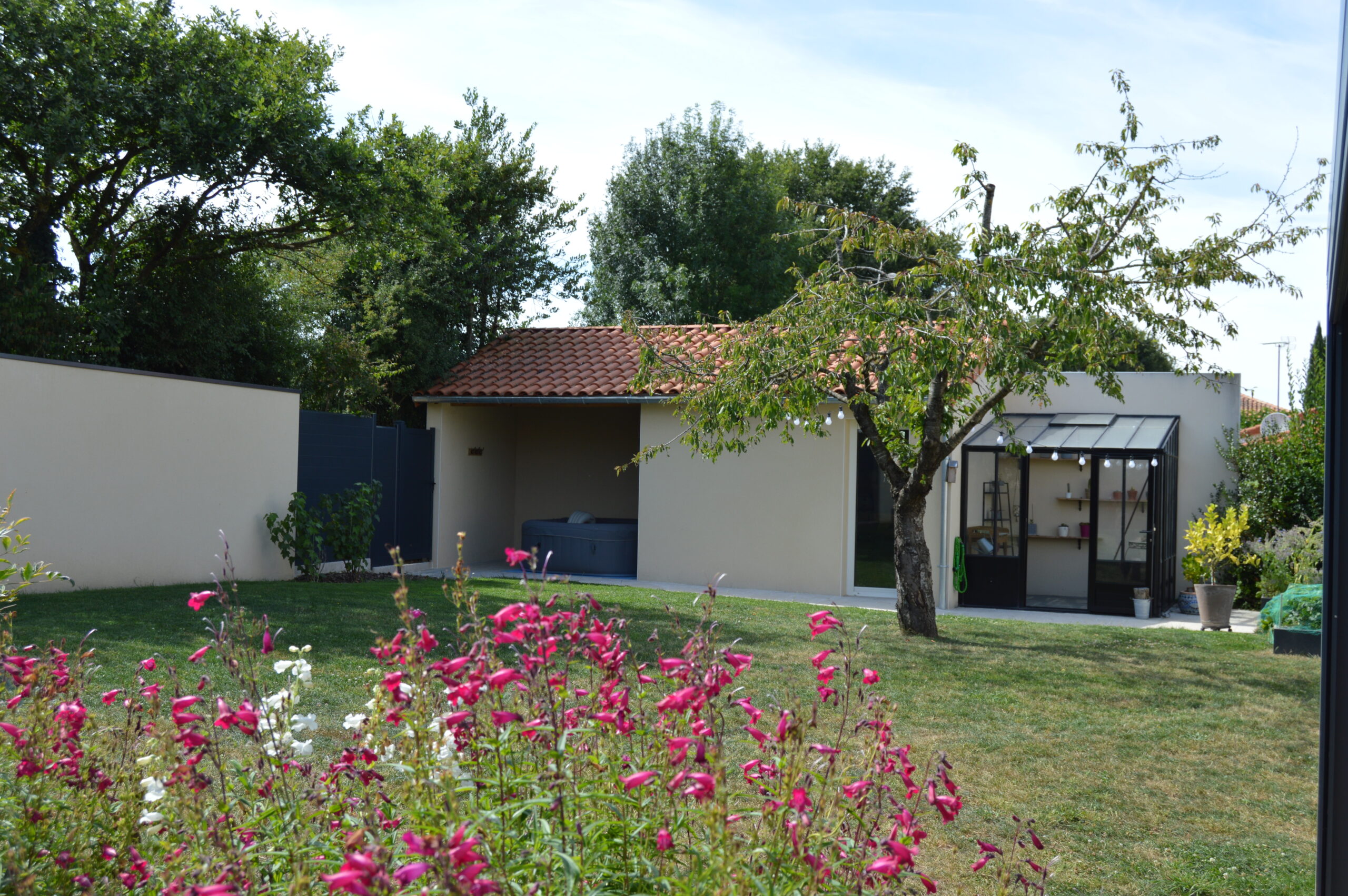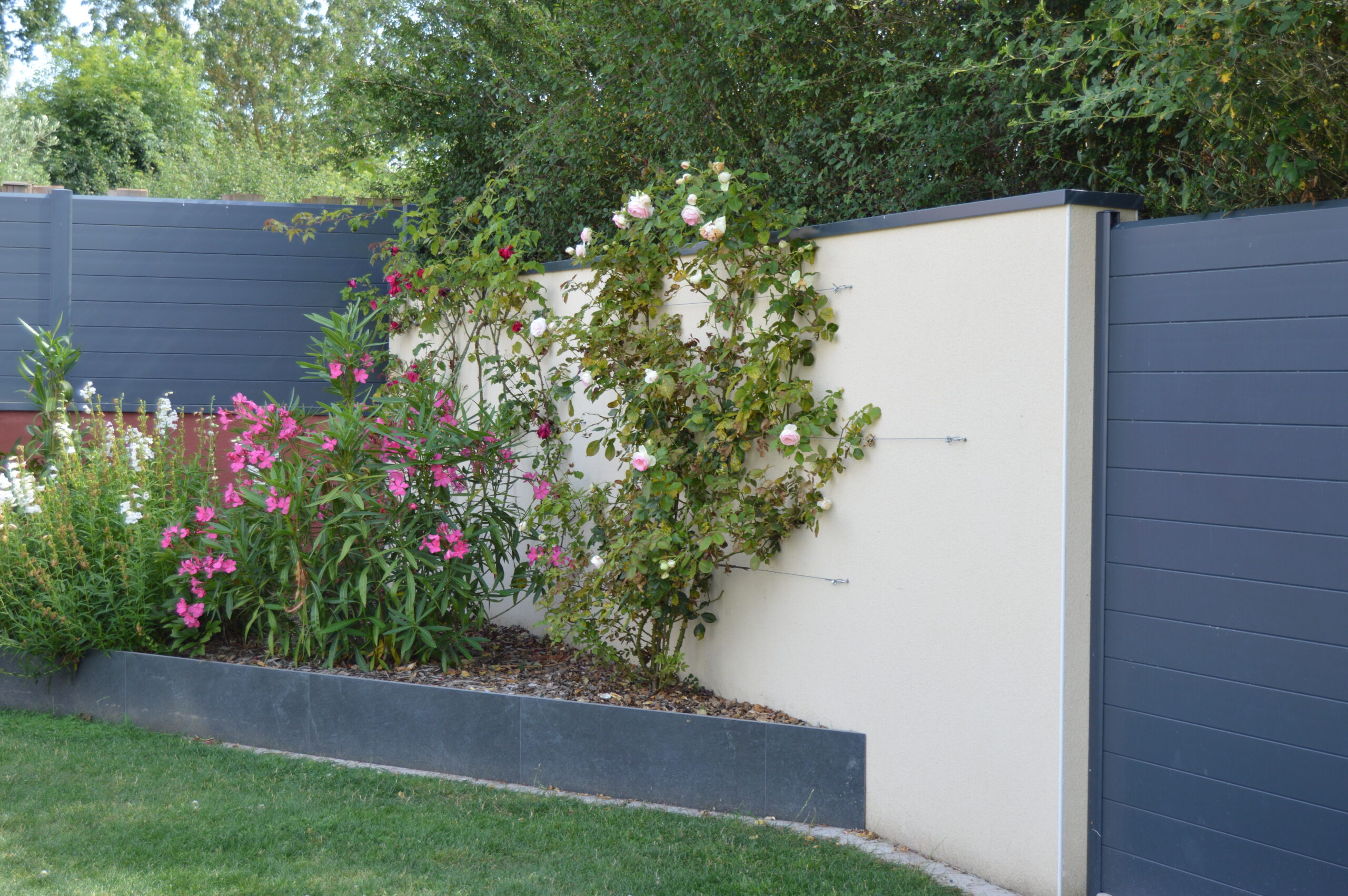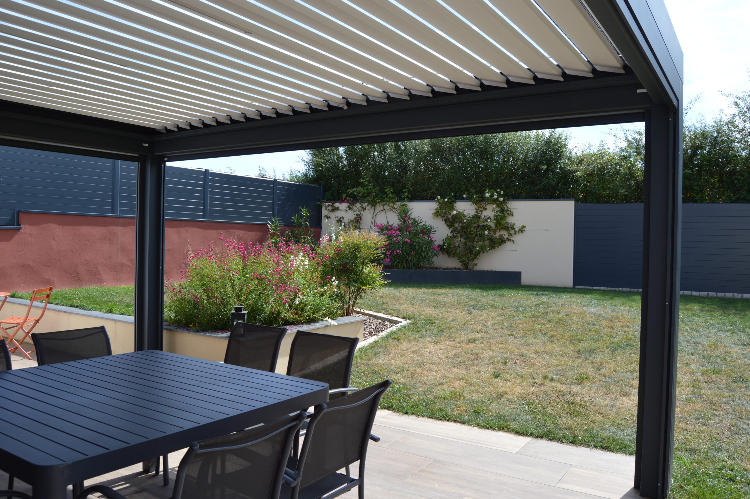Ce jardin s’articule autour d’une terrasse en grès cérame et d’un coin potager. Les deux espaces sont reliés par un éclaté de pas japonais en ardoise.