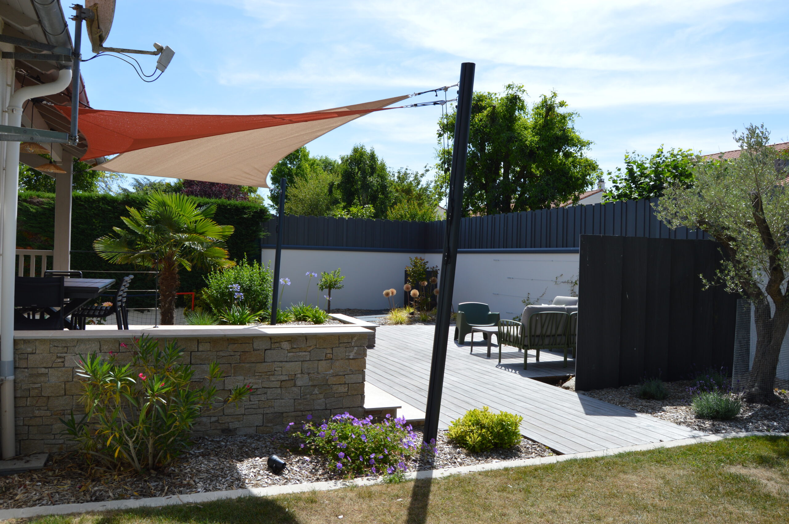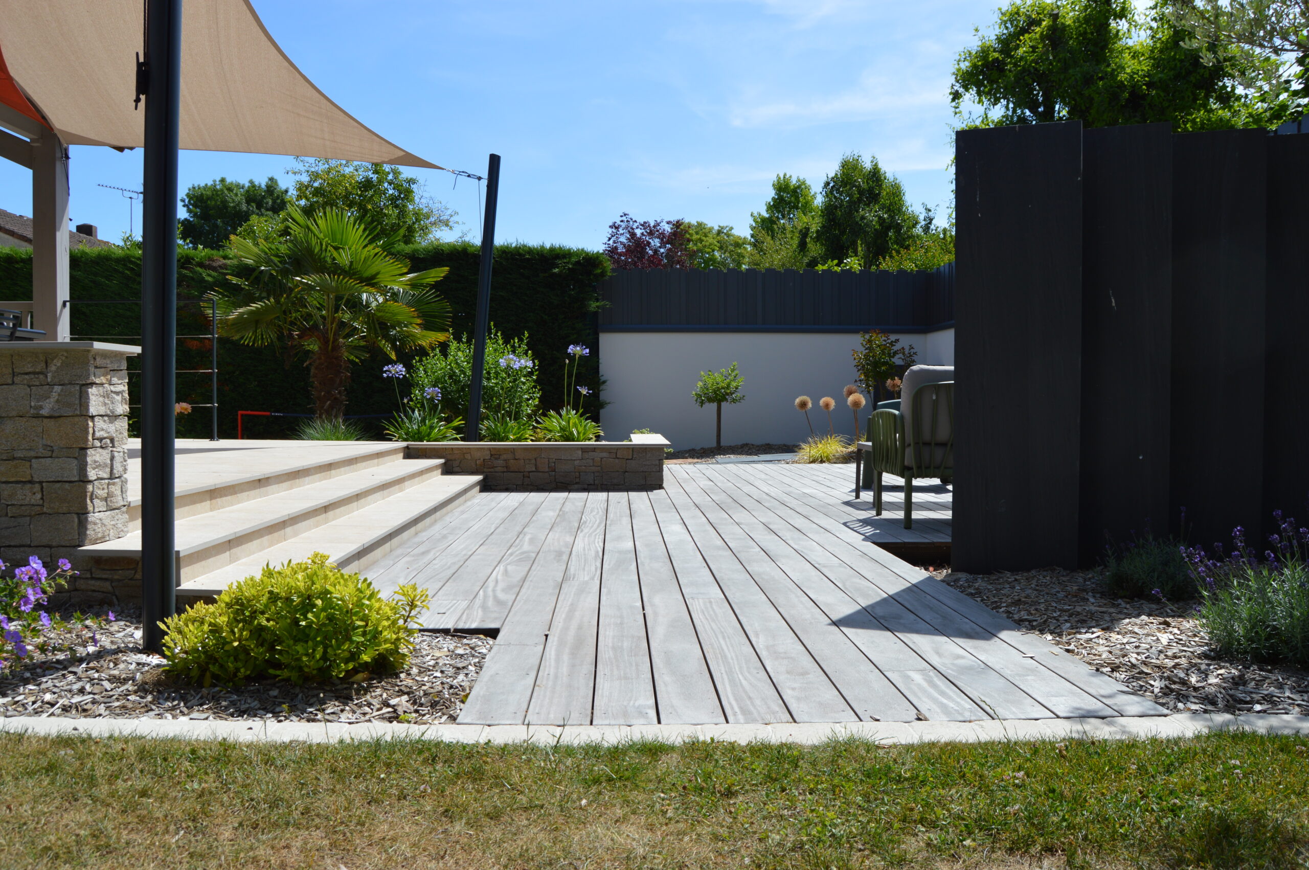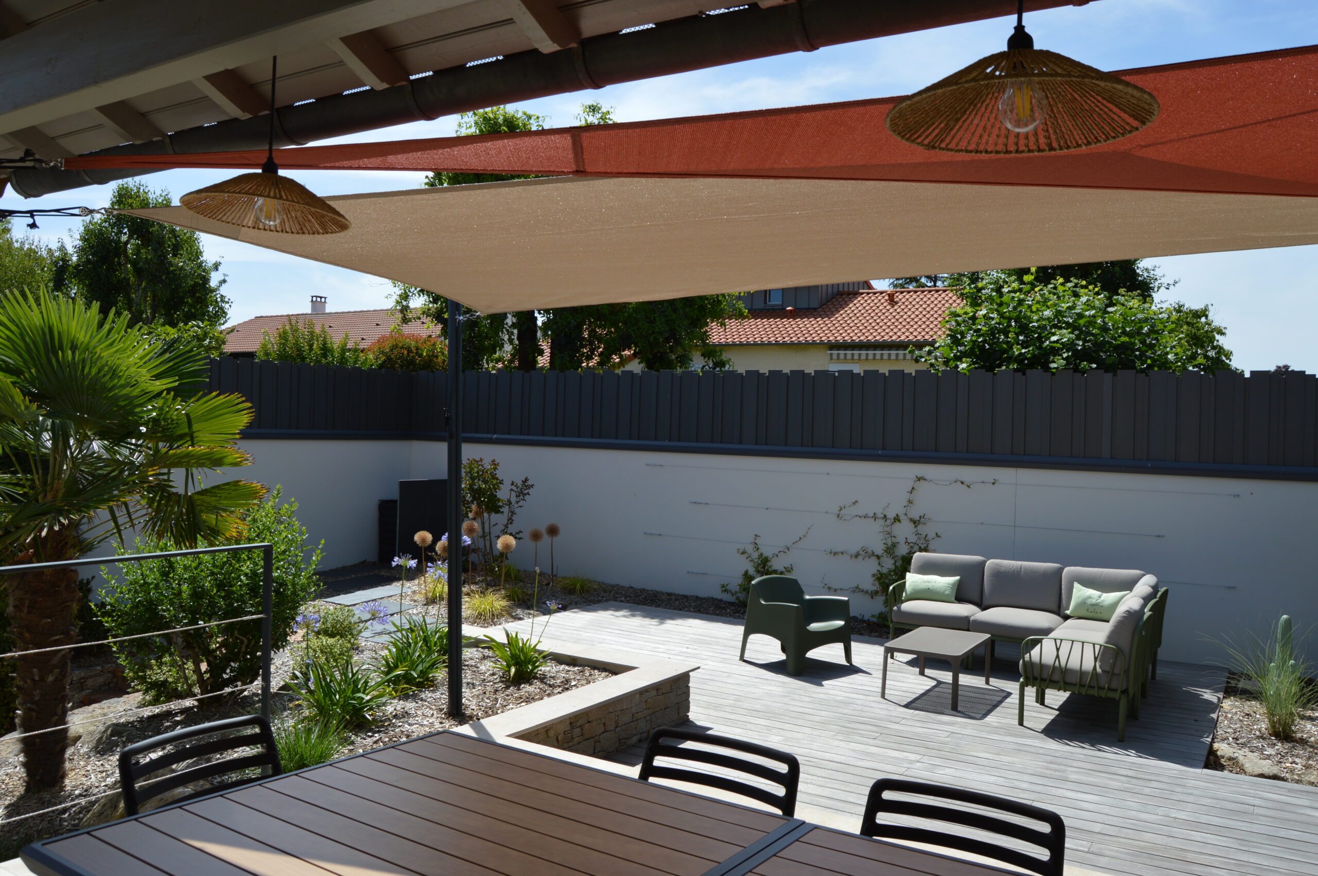 Intégration de terrasses et de brises vue dans ce jardin auparavant peu exploité.